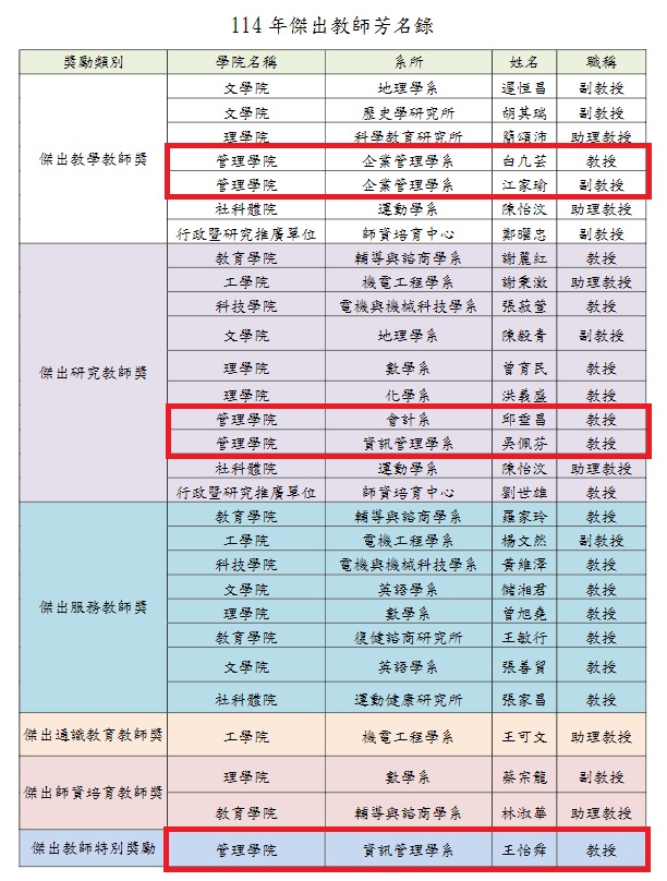 ※恭喜獲獎師長,研發處將統一辦理頒獎事宜※