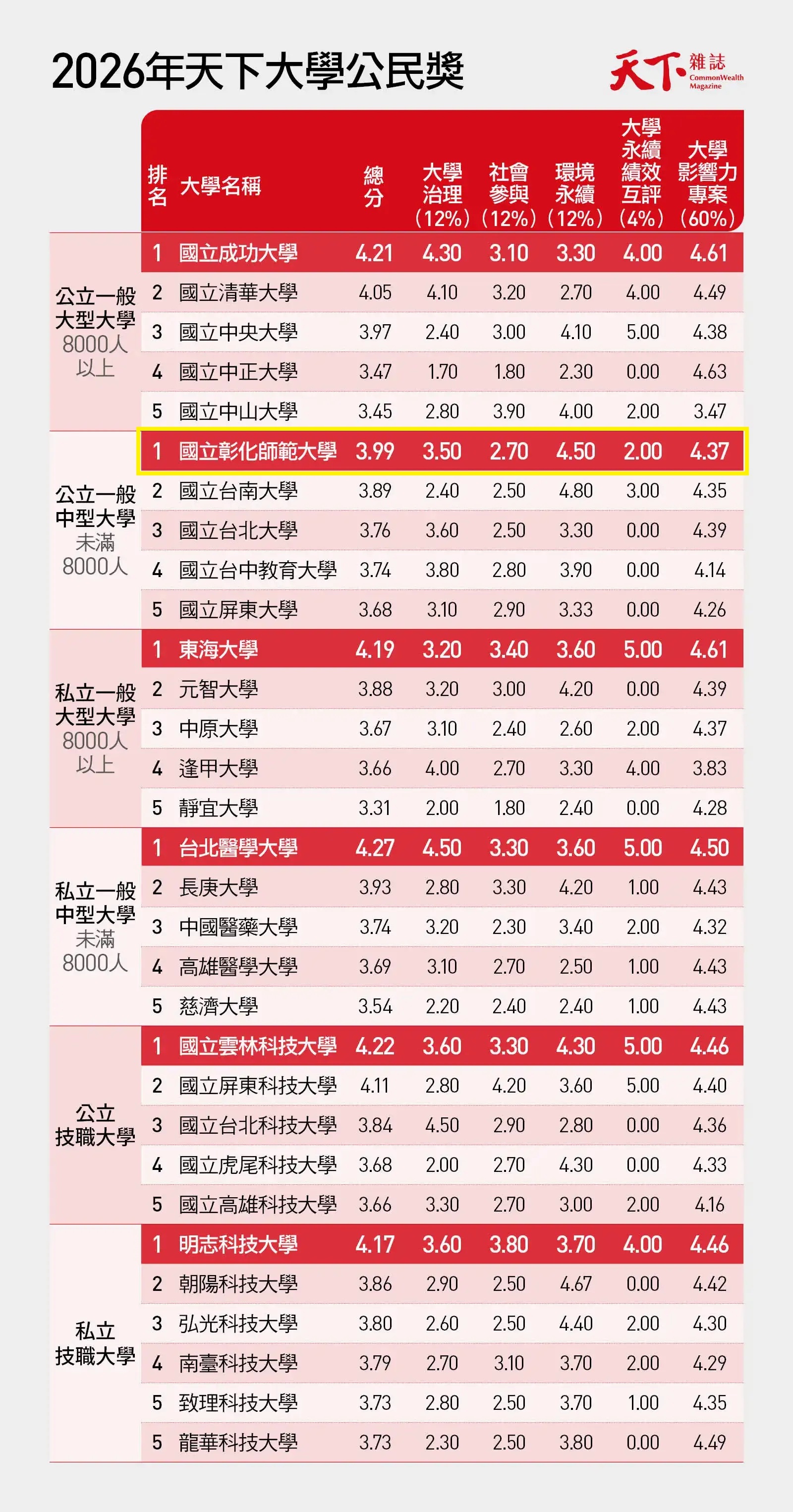 公立一般大學,大型組由成功大學重回王者寶座,中型組則由彰師大拔得頭籌,兩校在專案與量化分數均表現突出。